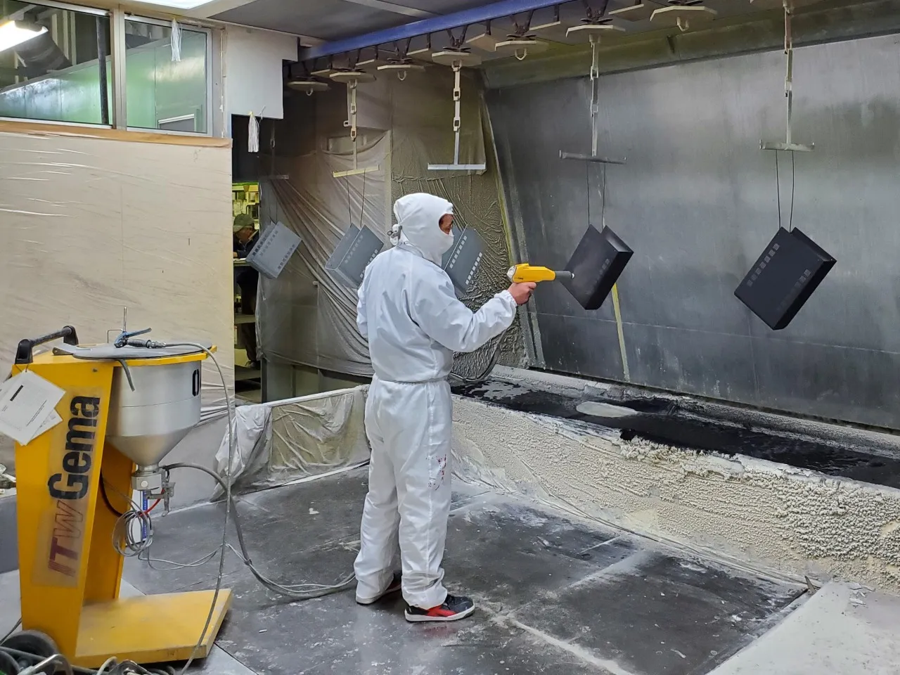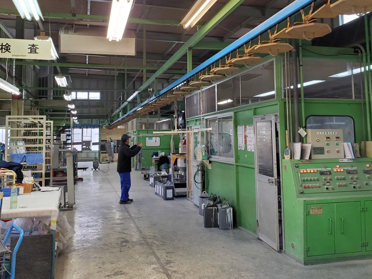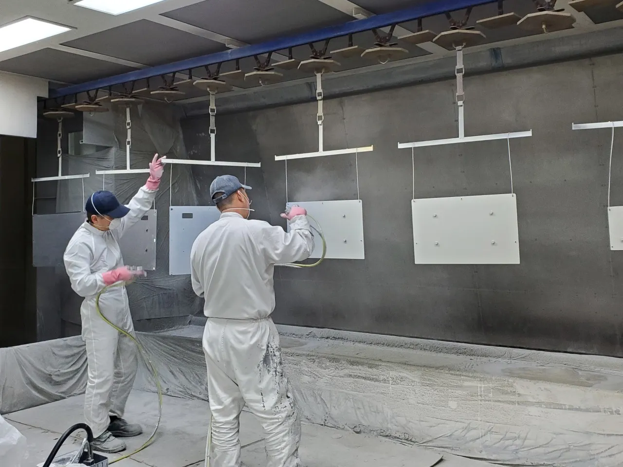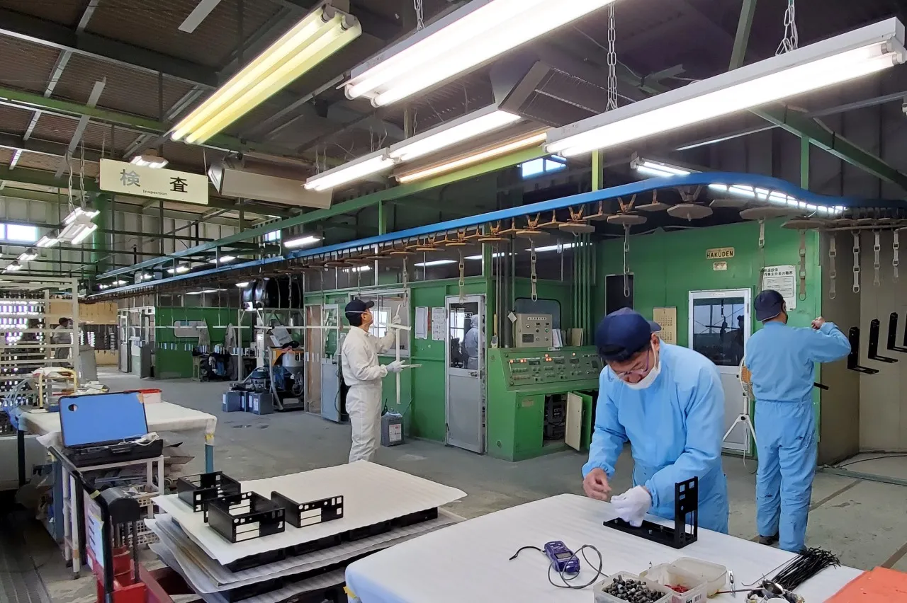 全長130mのトロリーコンベア式塗装ラインを備え、溶剤焼付塗装および粉体塗装の双方に対応し、量産品から多品種少量品まで柔軟な生産体制を整えています。