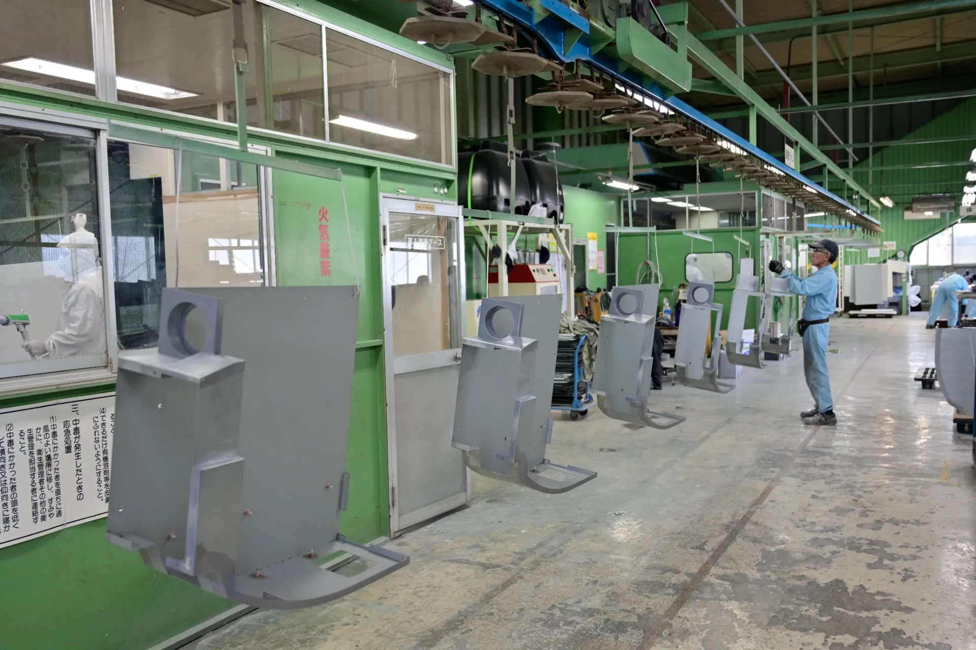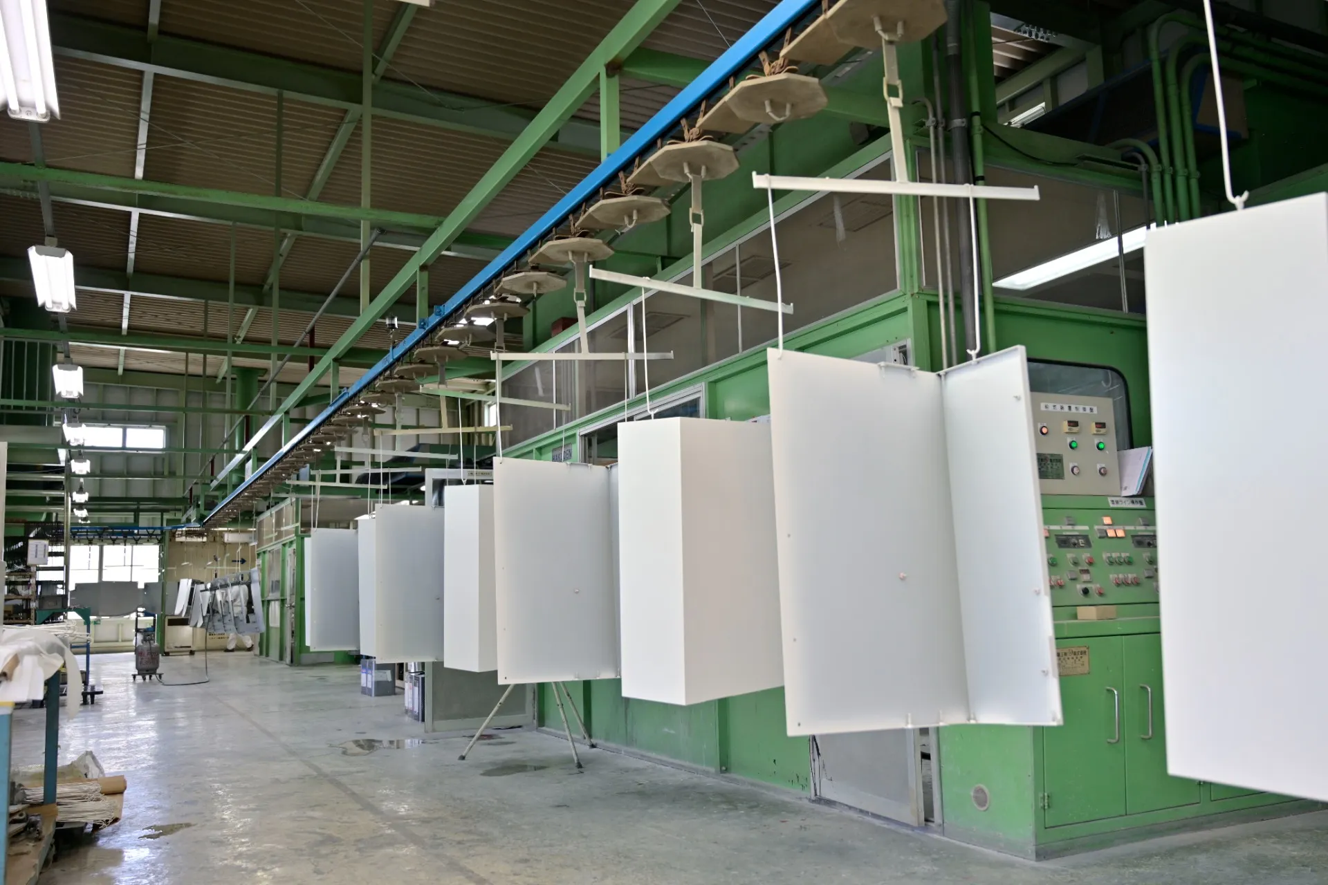 全長130mのトロリーコンベア式塗装ラインを備え、装置メーカー向けのフレームやパネル類を中心に、溶剤塗装・粉体塗装に対応しています。量産品から多品種少量品まで柔軟に対応し、製品ごとに最適な塗装条件を設定することで、安定した品質を実現します。 有効寸法は約2.0m×1.2m×0.6m